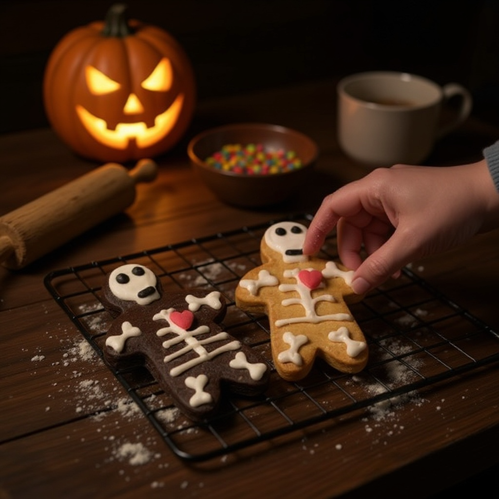 Due scheletri spaventosi ma deliziosi, preparati con pasta frolla e decorati con glassa allo yogurt.